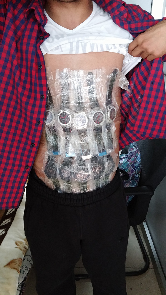 Sarp Gümrük Muhafaza Kaçakçılık ve İstihbarat Müdürlüğü ekipleri, Sarp Sınır Kapısı’ndan yaya olarak Türkiye’ye girmeye çalışan Gürcü uyruklu K.D, M.A, L.S ile A.S'nın hareketlerinden şüphelendi. X-ray cihazının ikaz vermesi üzerine K.D, M.A kadın ile L.S ile A.S. ekipler tarafından durduruldu. Zanlıların üzerlerinde görevli memurlarca yapılan aramada vücutlarına sarılı vaziyette çeşitli markalarda toplam 239 adet bay ve bayan kol saati ele geçirildi.