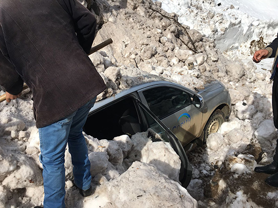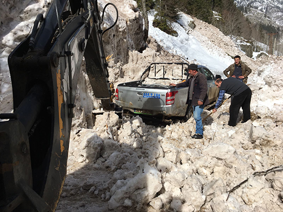Bölgeye gönderilen İl Özel İdaresi ekiplerince çığ altındaki aracı çıkarma çalışmaları devam ediyor.