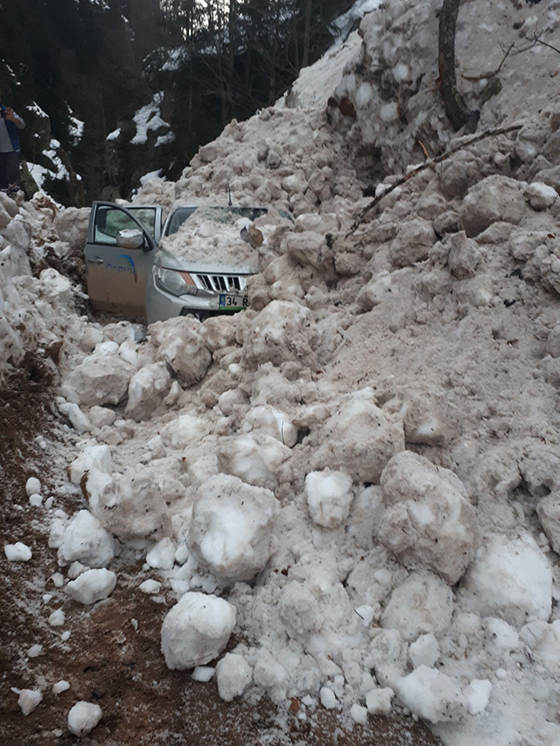 Üzerine çığ düşen kamyonetten yara almadan kurtuldular