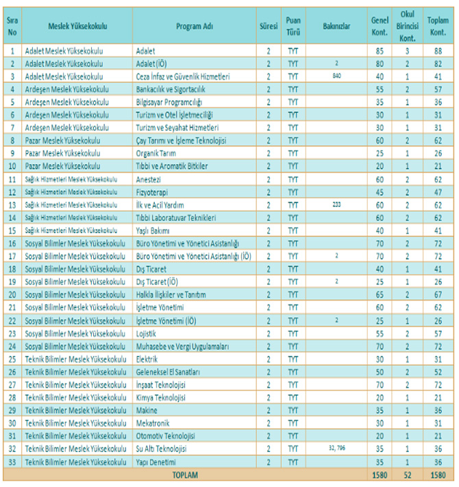 2018-YKS Kılavuzunda Yayımlanan RTEÜ Program ve Kontenjanları;