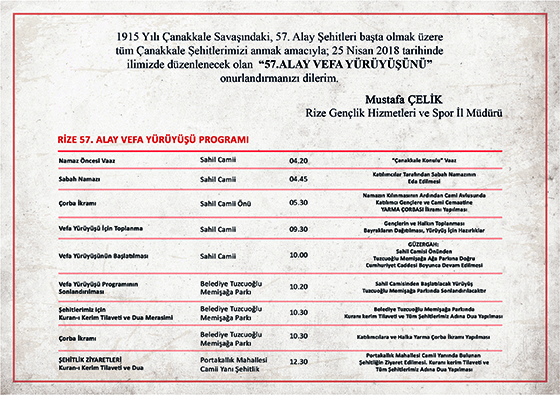 Rize’de 25 Nisan 2018 tarihinde Sahil Camiinde Sabah namazı ile başlayacak olan program saat 10:00’da Sahil Camiinden başlayıp Tuzcuoğlu Memişağa Parkında sona erecek ve Vefa yürüyüşü ile devam edecek. 57. Alay anma programı aynı gün Portakallık Mahallesi Portakallık Camii yanında bulunan Şehitlik ziyareti ile sona erecek.