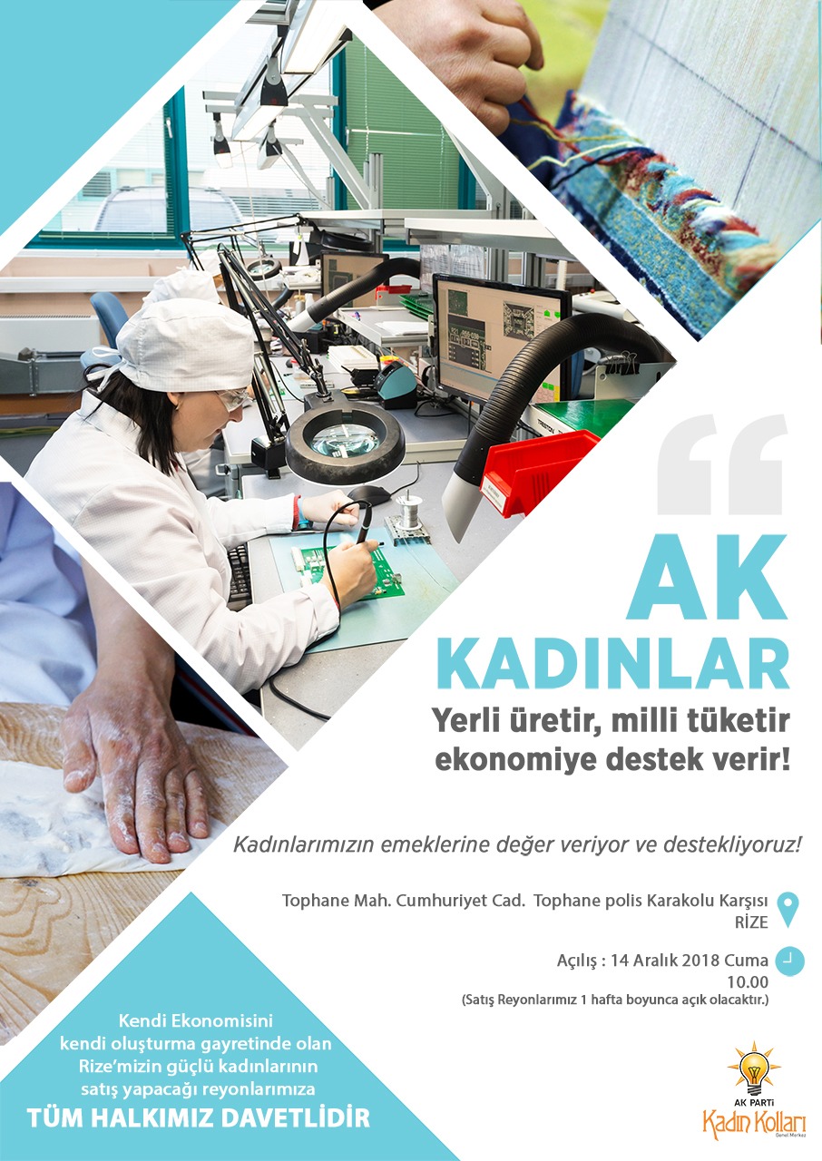 Ak Kadınlar Yerli Üretir Milli Tüketir Ekonomiye Destek Verir sloganıyla Rize'de Tophane Mahallesi Cumhuriyet Caddesi Tophane Polis Karakolu Karşısında Saat 10:00'da gerçekleştirilecek el emeği göz nuru tamamen yerli ürünlerin satışının yapılacağı ve yöresel yemeklerin de satışının yapılacağı etkinliğe tüm vatandaşlar davet edildi.