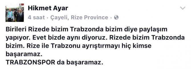 Ayar, gece saatlerinde sosyal medya hesabından yaptığı paylaşımda tarihe altın harflerle işlenecek şekilde Trabzonspor'a tarihi ders verirken, "Birileri Rizede bizim Trabzonda bizim diye paylaşım yapıyor. Evet bizde aynı diyoruz. Rizede bizim Trabzonda bizim. Rize ile Trabzonu ayrıştırmayı hiç kimse başaramaz. TRABZONSPOR da başaramaz." dedi.