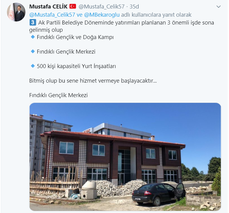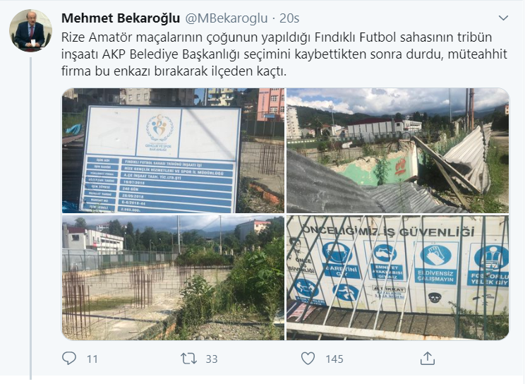 Bekaroğlu paylaşımda "Rize Amatör maçalarının çoğunun yapıldığı Fındıklı Futbol sahasının tribün inşaatı AKP Belediye Başkanlığı seçimini kaybettikten sonra durdu, müteahhit firma bu enkazı bırakarak ilçeden kaçtı." ifadelerini kullandı.