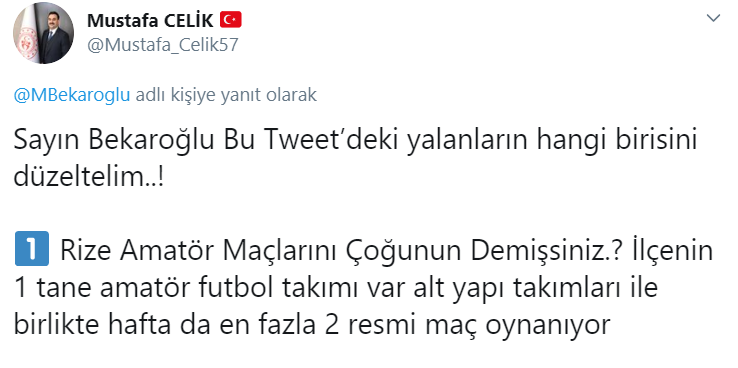 Çelik, sosyal medya hesabından yaptığı açıklamada Bekaroğlu'nu yalancılıkla itham etti. Fındıklı Futbol Sahası'nda haftada en fazla 2 resmi maçın oynandığını aktaran Çelik, Bekaroğlu'nun söylediği gibi Rize'deki amatör maçların çoğunun Fındıklı'da oynanması gibi bir durumun söz konusu olmadığını belirtti.