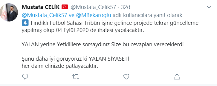 Fındıklı Futbol Sahası tribün inşaatının ise güncellendiğini dile getiren Çelik, ihalenin 4 Eylül'de yapılacağını aktararak "Yalan yerine yetkililere sorsaydınız size bu cevapları vereceklerdi. Şunu daha iyi görüyoruz ki yalan siyaseti her daim elinizde patlayacaktır." ifadelerini kullandı.