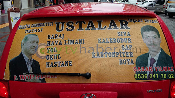 Recep Tayyip Erdoğan ile kendisine reklam afişi hazırlatan Rizeli Reklam dediğin böyle olur dedirtti. Aracının arka camına yaptırdığı reklam afişi görenlerin beğenisini toplarken afişi okuyanlar resim çekmekten de geri kalmadı.