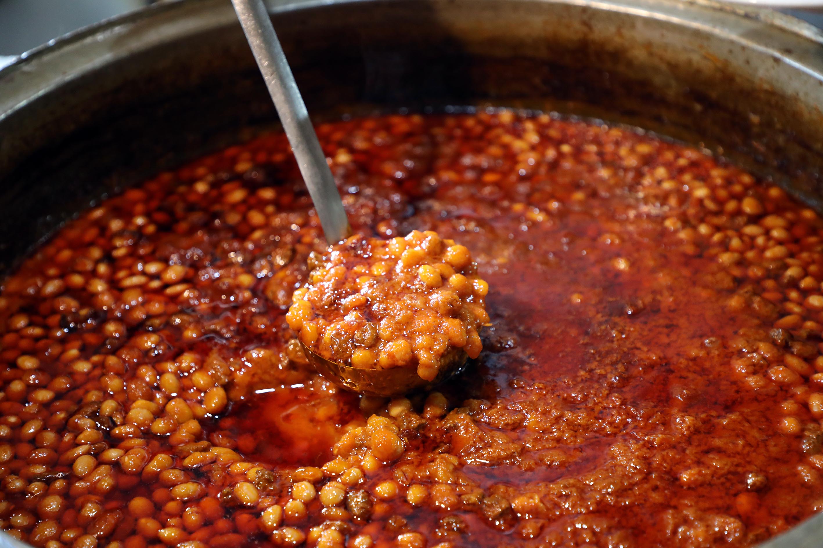 Kuşbaşı büyüklüğünde kesilen yağsız et, haşlandıktan sonra suyu süzülüyor. Bakır tencerede tereyağla kavrulan soğan ve yeşil biberin üzerine, önce sıcak suda eritilmiş şeker ve salça, ardından et ve haşlanmış kuru fasulye ekleniyor. Bu sırada yemeğin üzerine çıkan köpük alınıyor.