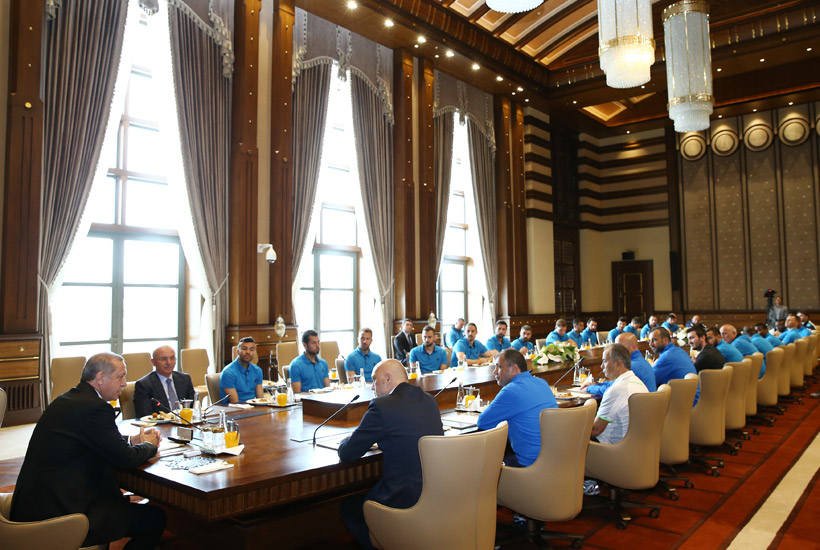 Cumhurbaşkanı Recep Tayyip Erdoğan Çaykur Rizesporlu futbolcuları ve teknik heyeti makamında kabul etti. Son Rize ziyaretinde Çaykur Rizespor’dan Akhisar maçı için galibiyet sözü alan Erdoğan takımı ağırladığı Saray’da tebrik etti.