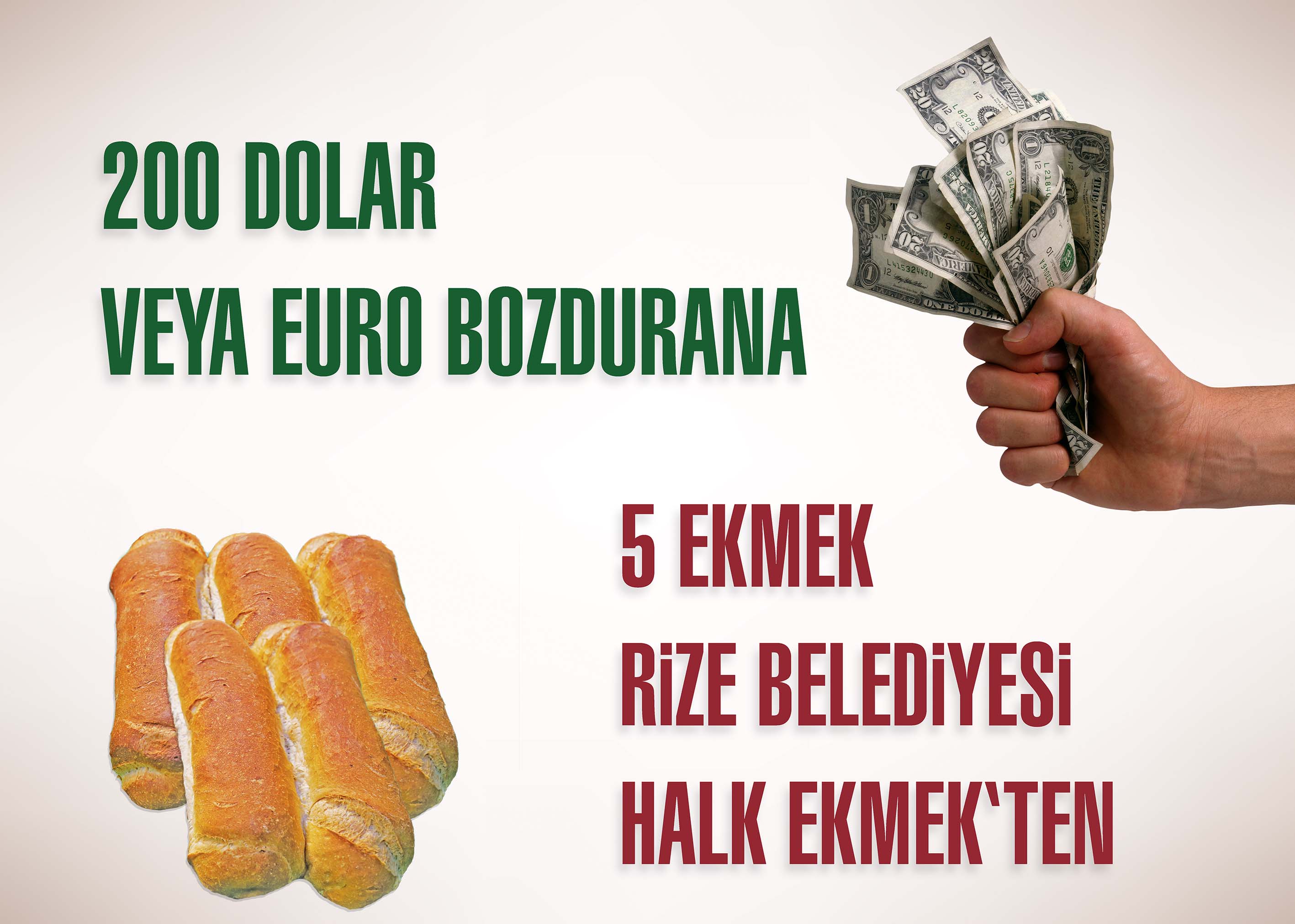 Rize Belediyesi Halk Ekmek Büfeleri’nde 200 Dolar’ını veya Euro’sunu bozdurup dekontu getiren vatandaşlara 5 ekmek ücretsiz olarak veriliyor.