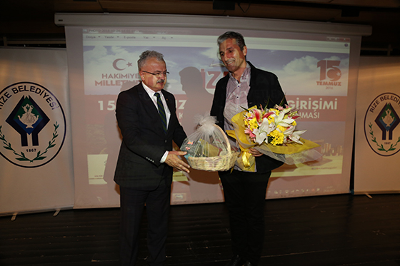 Konferans sonunda Rize Belediye Başkanı Prof. Dr. Reşat Kasap, Nedim Şener’e çiçek ve hediye takdim etti.