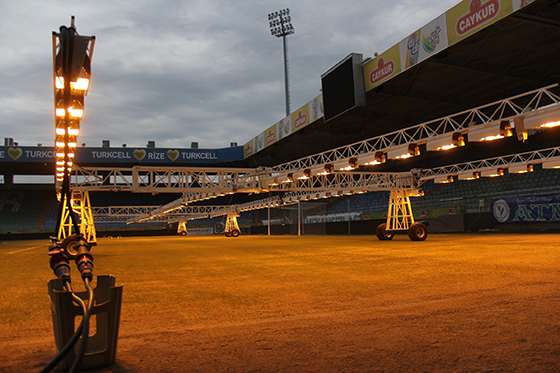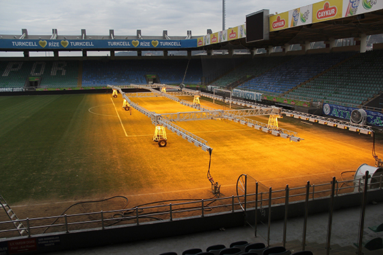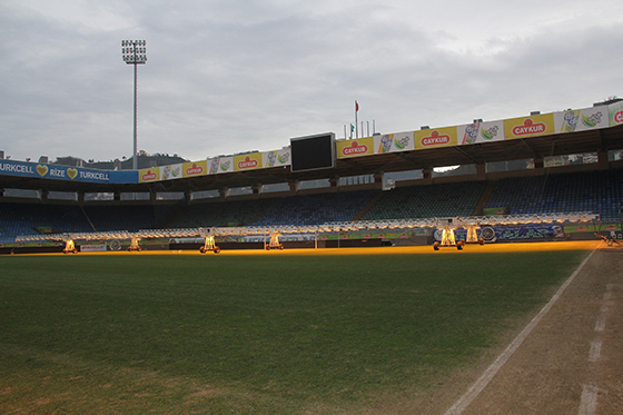 Türkiye’nin en fazla yağış alan ve güneşin en az görüldüğü ili olan Rize’de, ÇAYKUR Didi Stadyumu çimlerinin çürümemesi için çareyi yapay güneşte buldu.