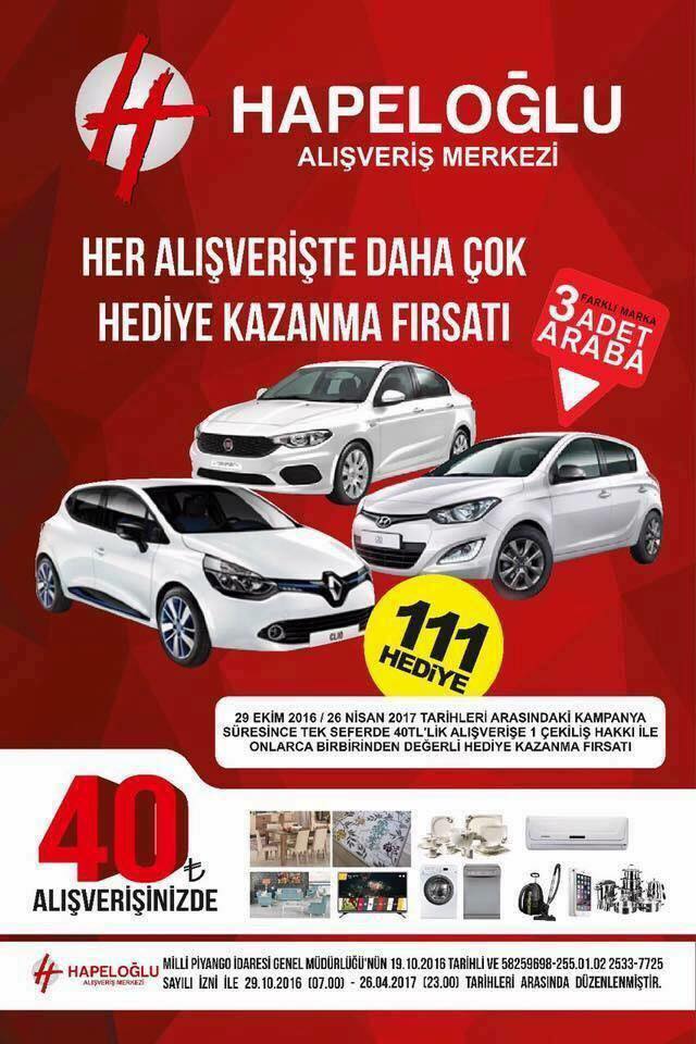 Hapeloğlu Alışveriş merkezi 29 ekim 2016 ile 26 nisan 2017 tarihleri arasında düzenlediği kampnaya sonrası 111 adet hediye çekilişi İsmail Kahraman Kültür merkezinde noter huzurunda çekildi..
