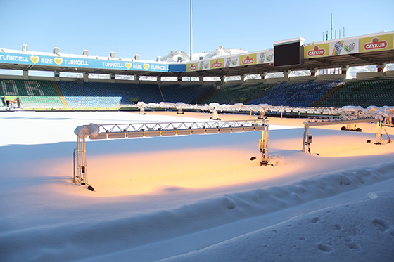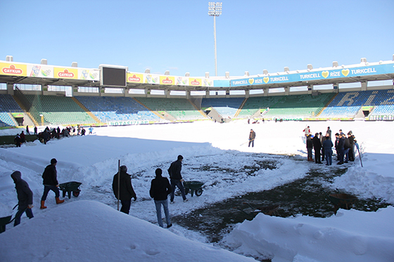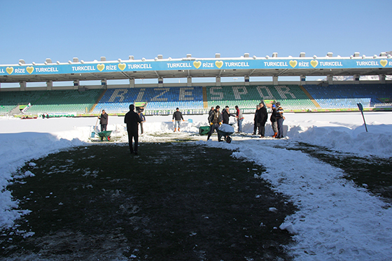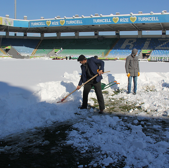 Çaykur Rizespor ile Mersin İdmanyurdu Ziraat Türkiye Kupası D Grubu son maçında yarın saat 17.00'de karşı karşıya gelecek. Mücadele öncesi üç gün etkili olan yoğun kar yağışı sonucu Çaykur Didi Stadyumu'nda 1 metre kalınlığında kar kütlesi oluştu. Sahanın maç saatine hazır hale getirilebilmesi için çalışmalara bir gün öncesinden başlandı. Zeminin zarar görmemesi için kar temizleme çalışmaları küreklerle ve el arabaları ile yavaş bir şekilde gerçekleştiriliyor.