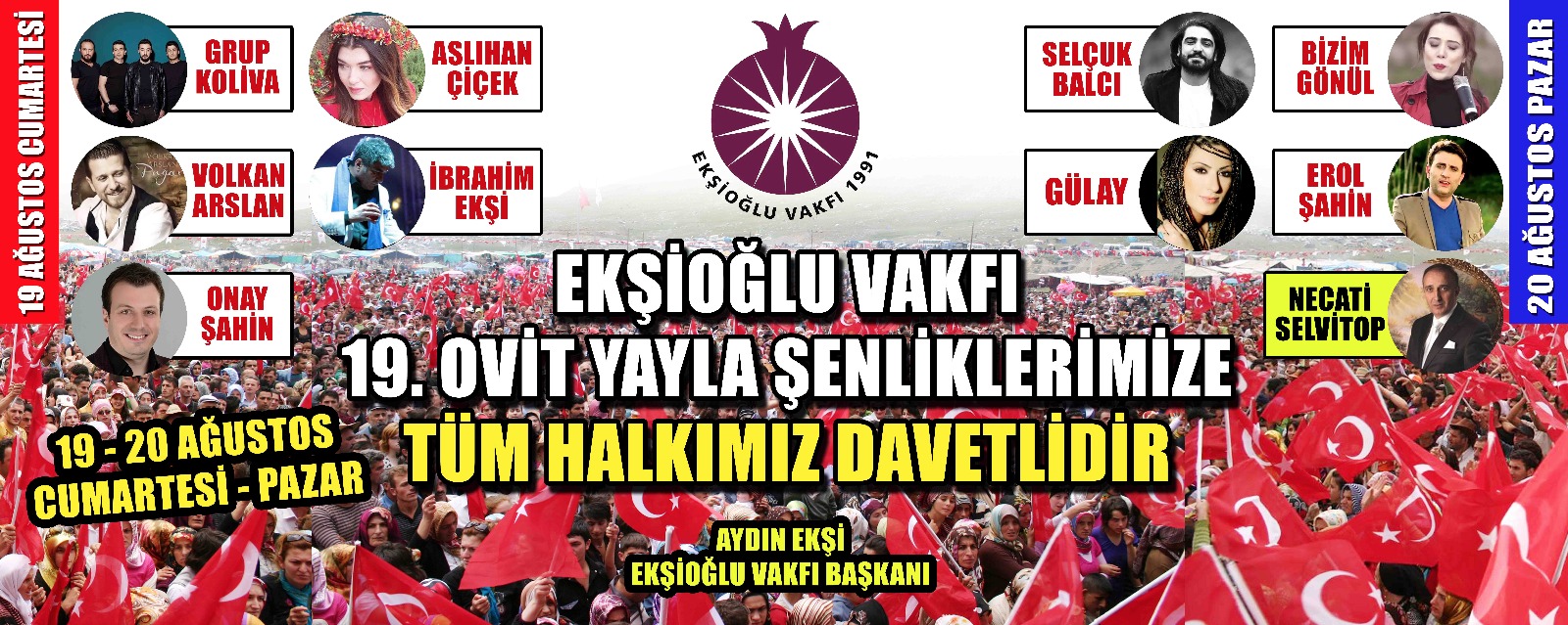 Ekşioğlu Vakfı Başkanı Aydın Ekşi ve Başkan Vekili Süleyman Ekşi, Karadeniz Bölgesinin en büyük yayla şenliklerinden olan ve her yıl geleneksel olarak yapılan Ovit Yayla Şenliklerine tüm vatandaşları davet etti. Şenliklerin Cuma akşamı şehitler içim Kuran-ı Kerim okutulması ile başlayacağını ifade eden Vakıf Yöneticileri Cumartesi ve Pazar günü Karadenizli sanatçıların katılımı ile müzik ziyafeti sunulacağını söyledi. Ülkede bugünlerde en çok ihtiyaç duyulan birlik ve beraberliğe katkı sağlayacak şenliklerle insanların kaynaşmasının yanında bölgenin tanıtımını da amaçladıklarını vurgulayan Ekşioğlu Vakfı yönetimi 20 bin şanlı Türk bayrağının dalgalanacağı yaylada buluşma çağrısı yaptı.