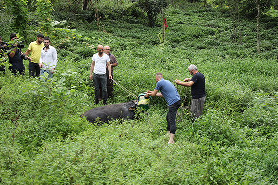 Hayvanı kendi çabalarıyla ahırdan çıkarıp kesemeyeceklerine karar veren kurban sahipleri, durumu Rize Belediyesi Veteriner İşleri Müdürlüğü ekiplerine bildirdi.