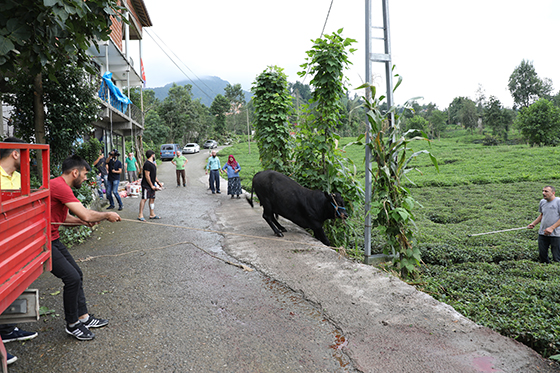 Ekipler, boğayı bahçeden yola çıkardı. Yolda bir kez daha ipten kurtulmayı başaran boğa yeniden çay bahçesine girdi. Kurban sahipleri çay bahçesinde yeniden yakalayarak ağaca bağladıkları boğayı burada kesmeye karar verdi.