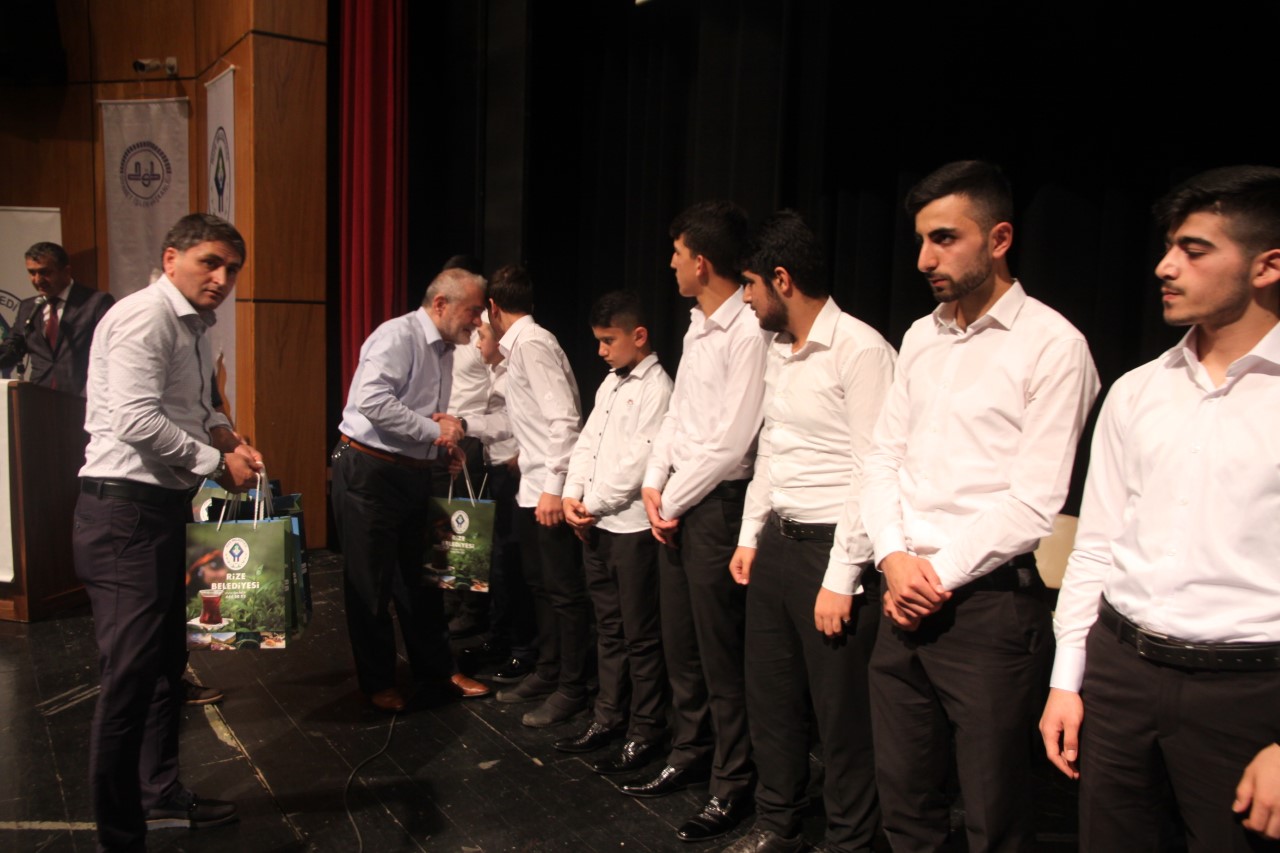 Rize Belediye tarafından genç hafızlar için hazırlanan hediyeler Başkan Yardımcısı Sultan Yılmaz ve İl Müftüsü İsmail Yalçın tarafından öğrencilere takdim edildi.