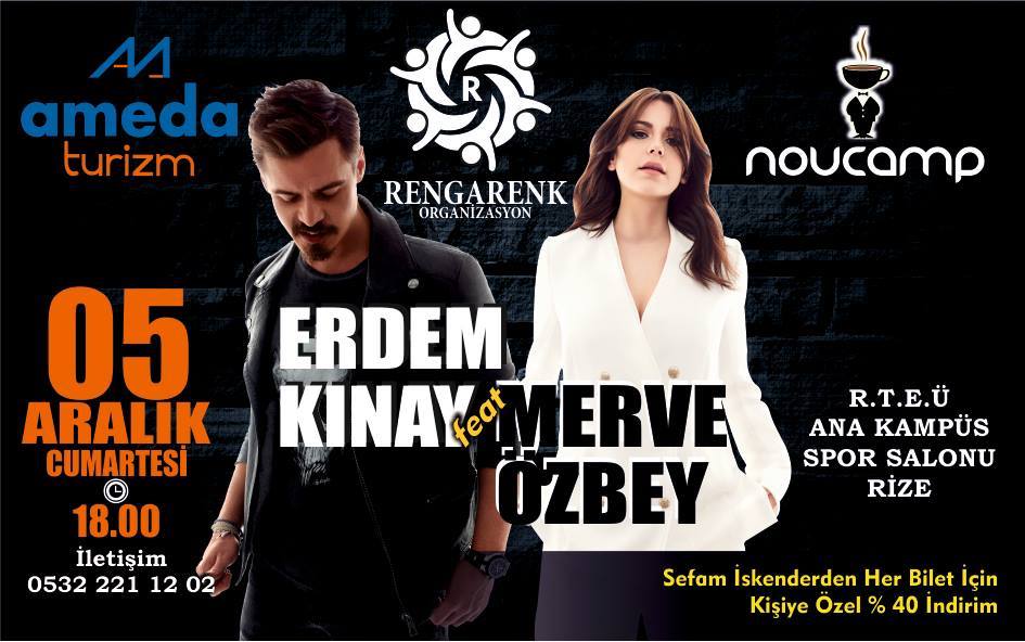 Rize'de bir çok başarılı organizasyonu imza atan Rengarenk organizasyon bu kez Erdem Kınay & Merve Özbey konseri ile adından söz ettirecek. 5 Aralık Cumartesi saat 18:00'da R.T.E.Ü ana kampüsünde Erdem Kınay & Merve Özbey konseri düzenlenecek.