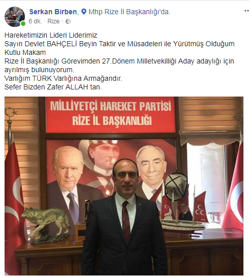 Rize Mhp il başkanı Serkan Birben Rize Milletvekilliği için il başkanlığından istifa etti..