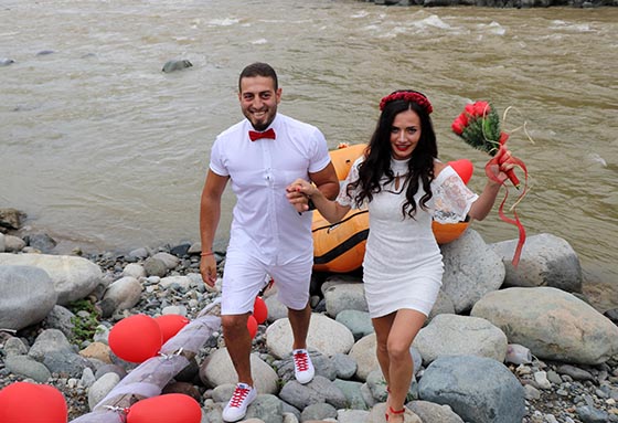 Rize'nin Ardeşen ilçesinde, rafting milli takım antrenörü Aydın Aksoy ile Gamze Terzioğlu, nikah törenlerine rafting botuyla geldi.