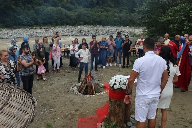 Rafting botu üzerinde Fırtına Deresi'nde kürek çeken çift, bir süre sonra kıyıya çıktı. Davetlilerin karşıladığı çiftin nikahını, ağaç kütüklerinin üzerinde Ardeşen Belediye Başkanı Hakan Gültekin kıydı.