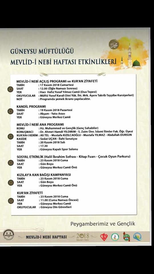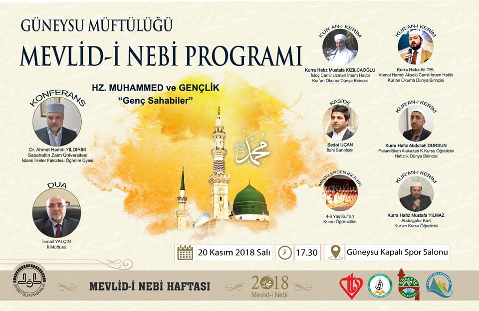 GÜNEYSU MÜFTÜLÜĞÜNÜN ORGANİZE ETTİĞİ DÜNYA 1.Sİ HAFIZLAR ALİ TEL – MUSTAFA KIZILCIOĞLU – APDULLAH DURSUN – MUSTAFA YILMAZIN MÜTHİŞ TİLAVETLERİ , SEDAT UÇAN VE EKİBİNİN İLAHİ VE KASİDELERİ DR. AHMET HAMDİ YILDIRIMIN KONFERANSI VE MİNİKLERİN PEYGAMBER SEVGİSİ GÖSTERİLERİ İLE MEVLİDİ NEBİ PROGRAMI 20 KASIM 2018 SALI SAAT 17.30’DA GÜNEYSU KAPALI SPOR SALONUNDA YAPILACAKTIR.. TÜM HALKIMIZ DAVETLİDİR…