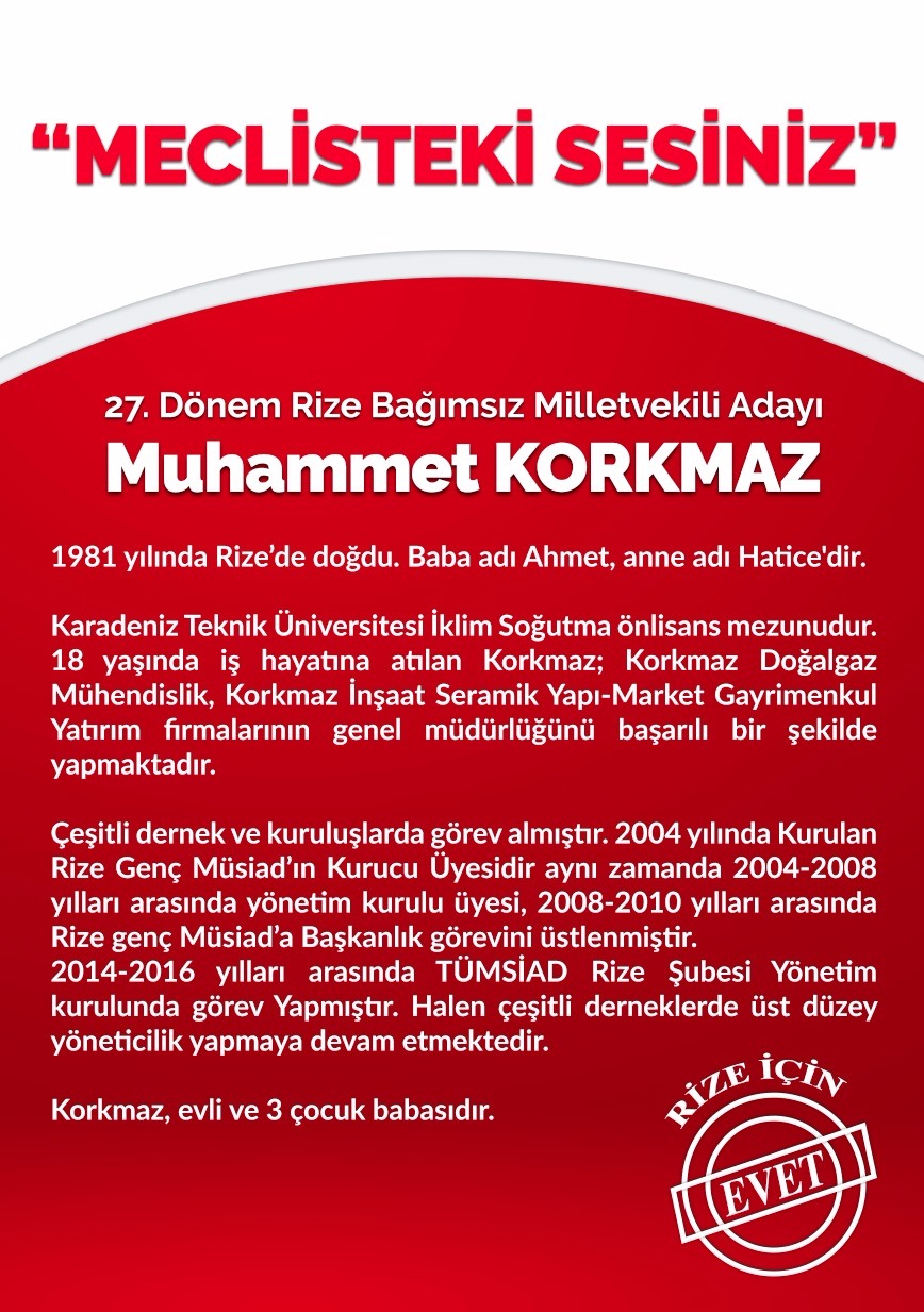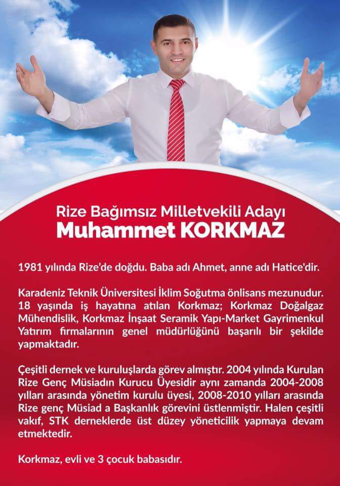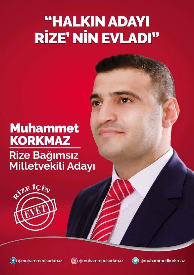 Rize Bağımsız Milletvekili Adayı Muhammet Korkmaz Çalışmalarını Sürdürüyor.Milletvekili adayı Korkmaz Hemşerilerimiz için bu yola çıktık aldığımız olumlu tepkiler her geçen gün artarak devam ediyor,siyset hizmet üretme sanatı bizlerde ilimiz için hizmet üretmek istiyoruz bunun yolunun da siysetten geçtiğini biliyorum bana destek veren herkese teşekkür ediyorum dedi.