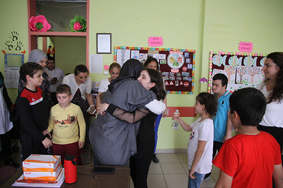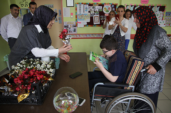 Sınıfta öğretmen ve öğrencilerle bir süre sohbet eden Rize Belediye Başkanı Prof. Dr. Reşat Kasap’ın eşi Menduha Kasap, ardından çocuklara çiçek ve Rıza İle Boyama kitabı hediye etti.