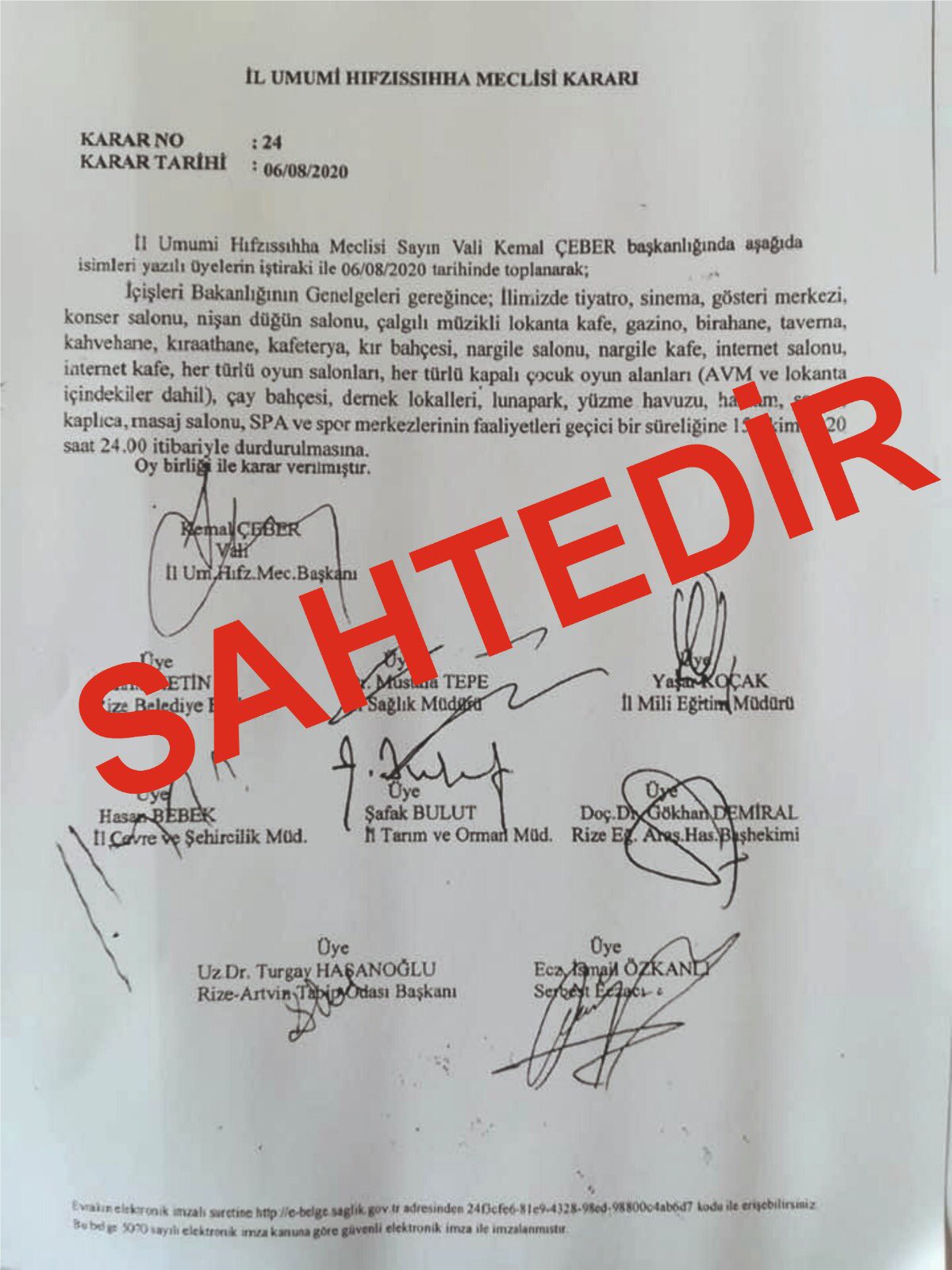 Rize İl Sağlık Müdürlüğü, sosyal medyada paylaşılan ve tiyatro, sinema, nişan ve düğün salonları, kıraathane, kafeterya gibi işletmelerin geçici süreliğine kapandığını içeren belgenin sahte olduğunu açıkladı.
