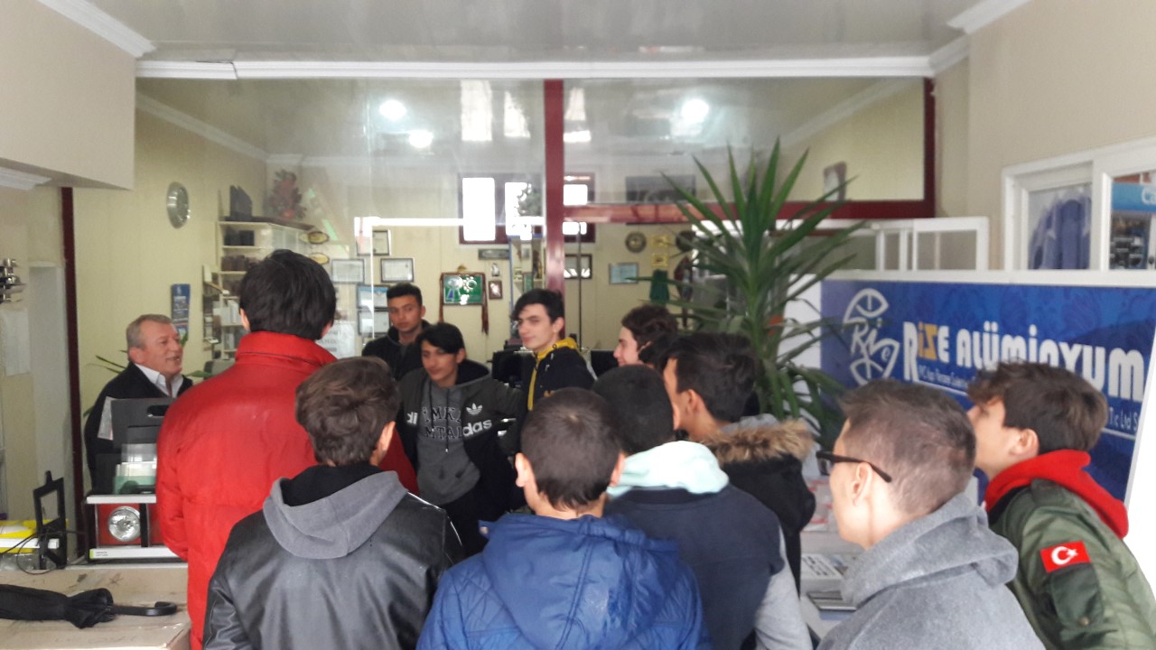 RİZE İMKB 10 TESİSAT ÖGRENCİLERİ REHBERLİK DERSİNDE SINIF ÖGRETMENI AYKURT AKYUZ ILE BIRLIKTE BU HAFTA " MESLEKİ EĞİTİMDE YERİNDE FARKINDALIK " DAN YOLA CIKARAK OKUDUKLARI BÖLÜME KARŞI MOTİVASYONLARINI ARTIRMAK AMACIYLA OKUL CEVRESINDE BULUNAN MESLEK GRUPLARINA YONELIK ESNAFLARA ZIYARETTE BULUNDULAR.