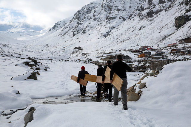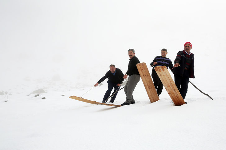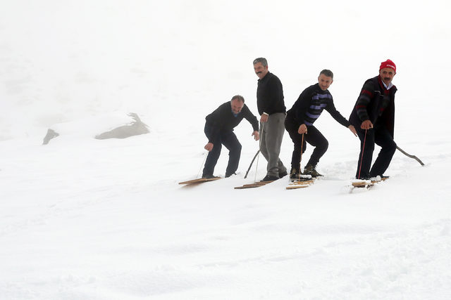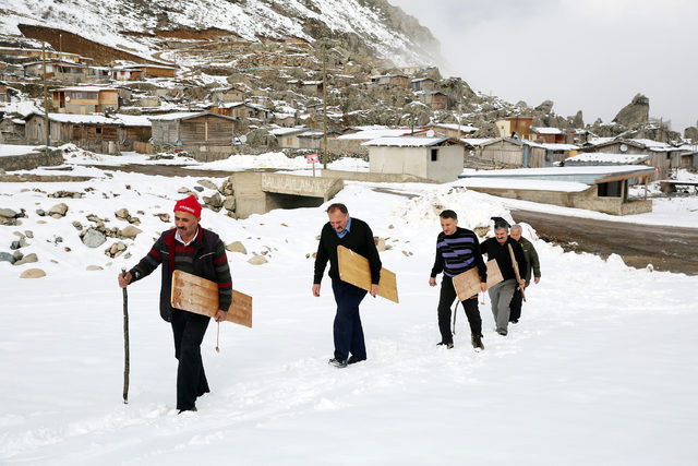 Mehmet Kurt ise, Kar 50-60 santimetre ve sert olduğunda hız yapabiliyoruz. Hızı kesmek için için ipi kullanıyoruz. Yollar kapalı olduğunda bu tahta ile aşağıya iniyoruz. En büyük eğlencemiz budur. Kışın hep kayarız ifadelerini kullandı.