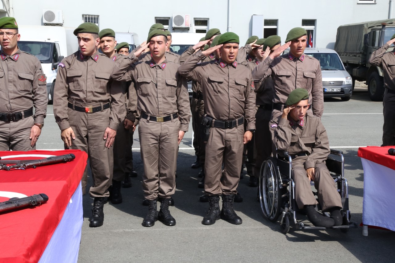 Vatani görevlerini yerine getirebilmeleri için başlatılan 1 günlük askerlik uygulamasından yararlanan 21 engelli genç, temsili ant içme töreninde engelli erlerin omuz omuza silah ve bayrak üzerine el basarak yemin ederek, terhis belgelerini aldılar.