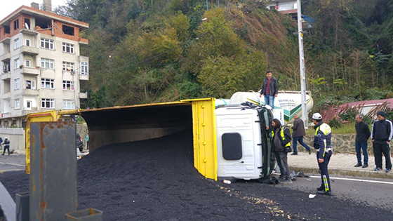 Edinilen bilgiye göre, Rize merkeze bağlı Portakallık Mahallesi Dağdibi Yolu'nda meydana gelen trafik kazasında H.A. kontrolündeki asfalt yüklü kamyon ile K.S. yönetimindeki bir otomobil çarpıştı. Çarpışmanın etkisi ile devrilen kamyonun kasasındaki asfalt yere savruldu. Otomobil sürücüsü K.S. ağır yaralanarak Recep Tayyip Erdoğan Üniversitesi Eğitim ve Araştırma Hastanesi'nde tedavi altına alındı. Rize Devlet Hastanesi'nde tedavi altına alınan kamyon sürücüsü H.A.'nın ise hafif yaralı olduğu öğrenildi.