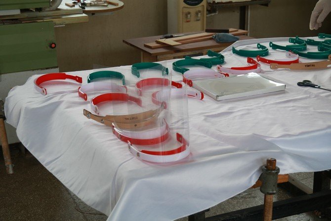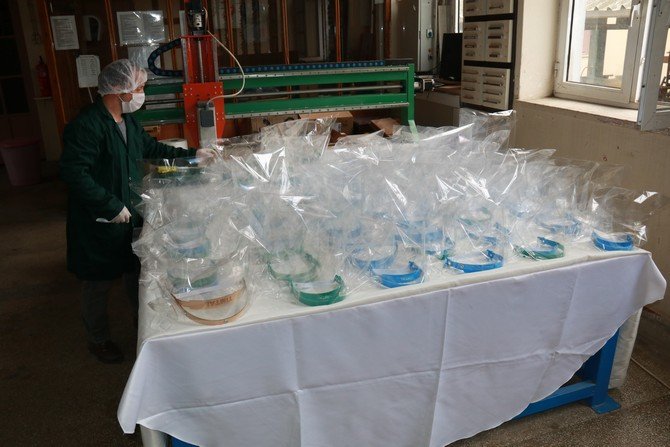 Rize Tevfik İleri Mesleki ve Teknik Anadolu Lisesi'nde çalışan gönüllü öğretmen ve personeller sağlık çalışanları için özel yüz siperliği üretiyor.