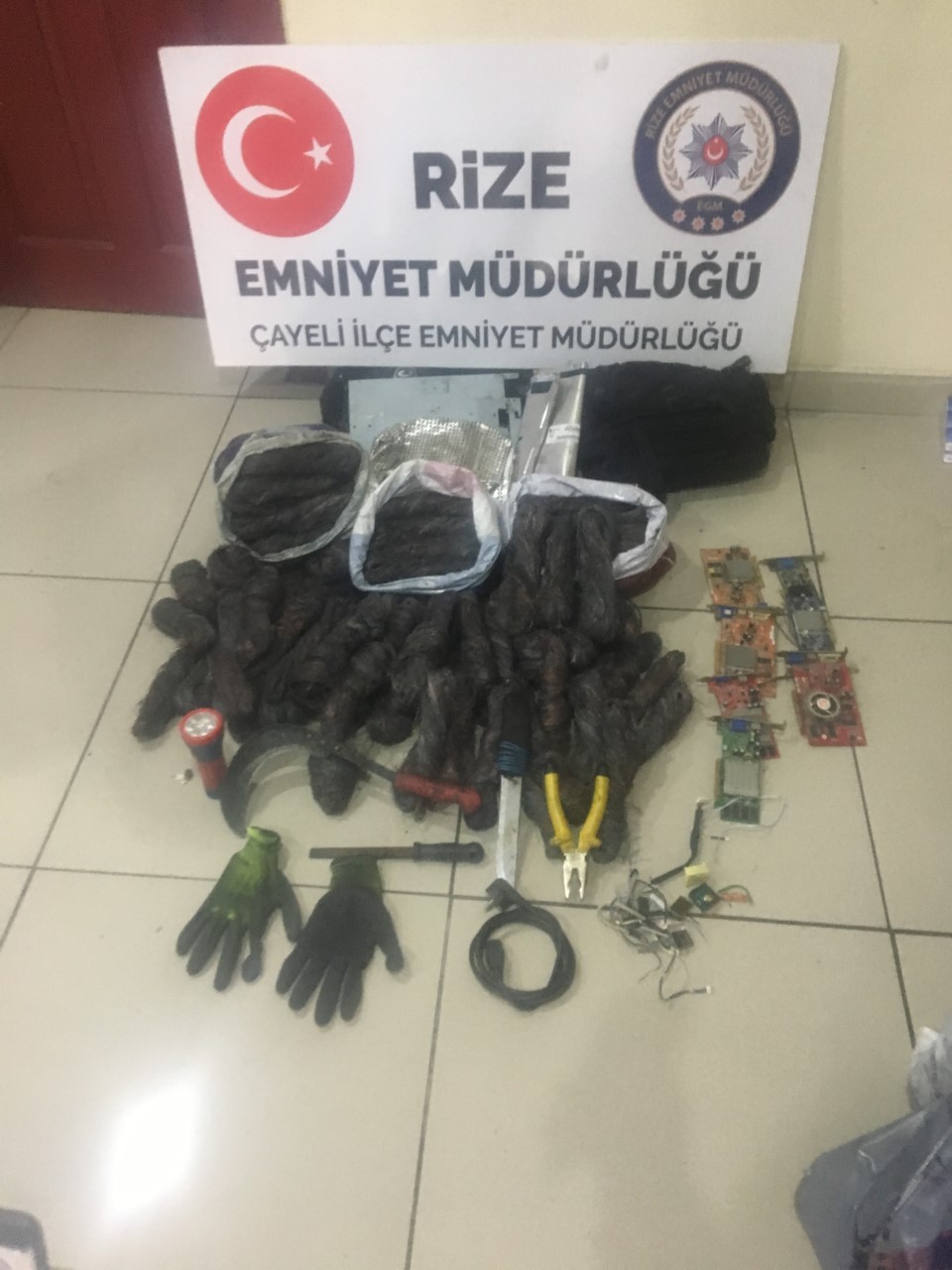 Çayeli ilçesinde meydana gelen 2 ayrı Bakır Kablo Hırsızlığı Olayı ile ilgili olarak yapılan titiz çalışma sonucu, 25.11.2018 günü saat 05:00 sıralarında bisikletle seyir hâlinde iken durumundan şüphelenilen G.KONTSELİDZE isimli Gürcü şahıs durdurulmuş ve yapılan üst aramasında sırt çantasındaki çaldığı 40 kg bakır kablo ile yakalanmıştır.