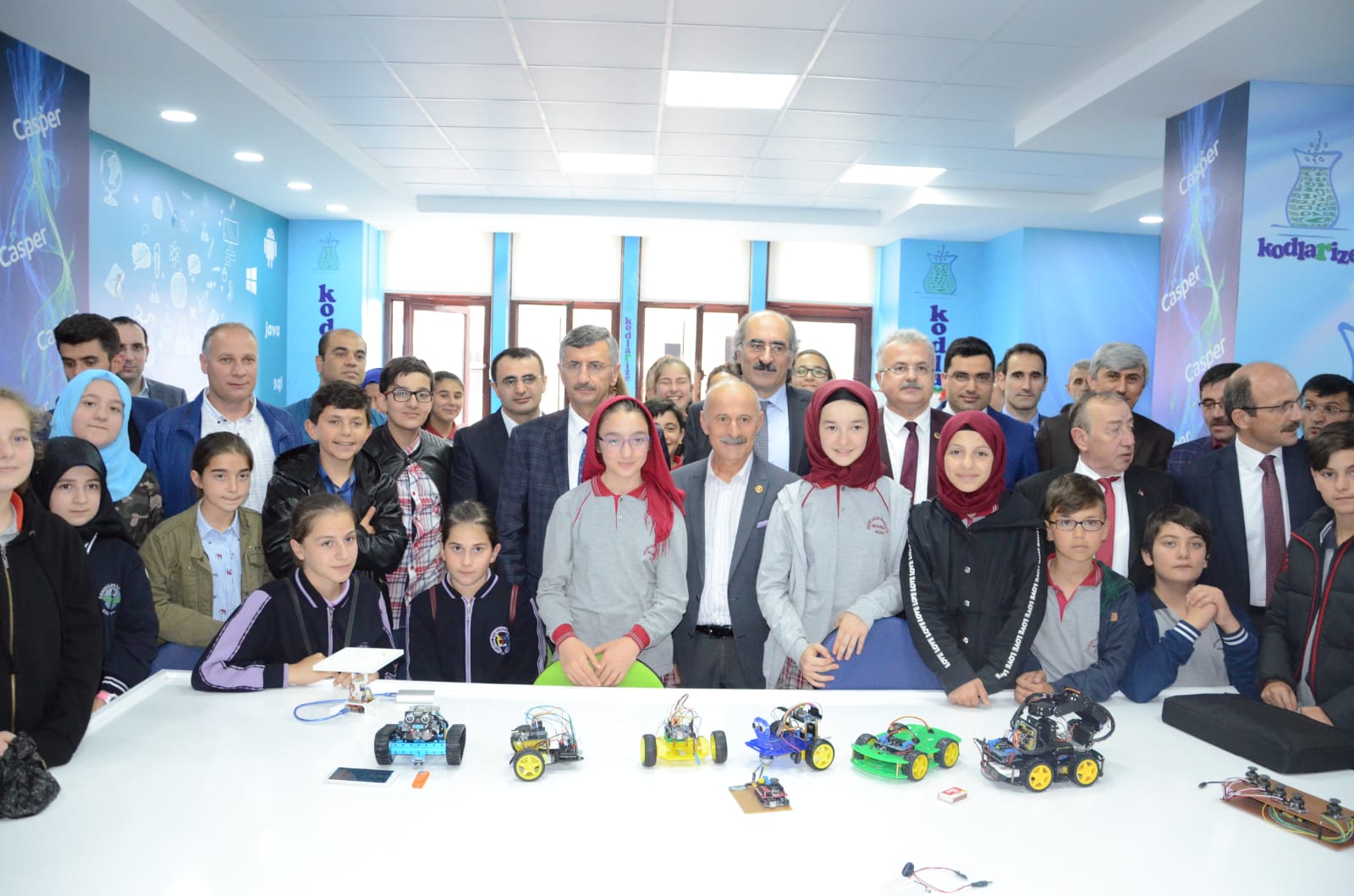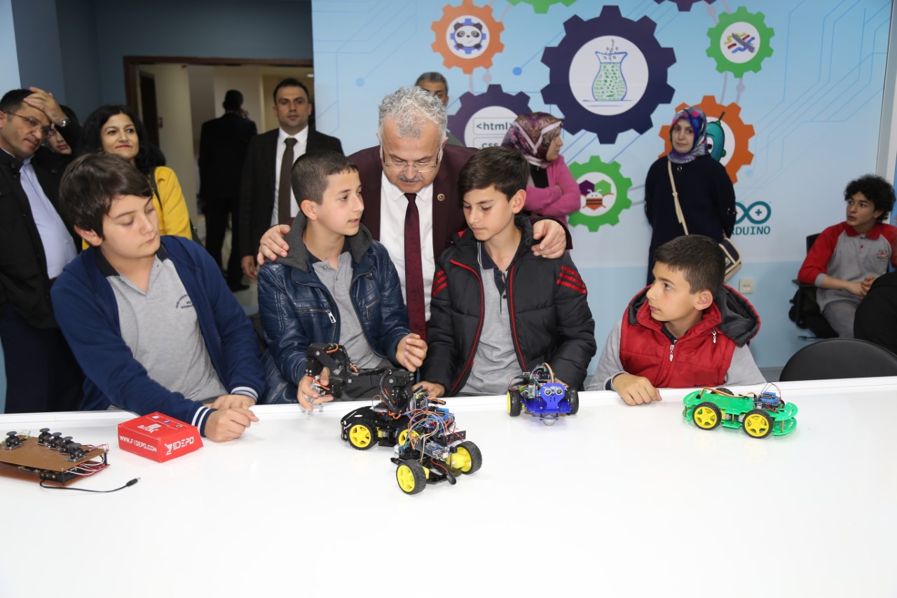 Açılışta,öğrenci ve öğretmenlerinin kodlarla geliştirdiği robotlar ve oyunlar sergilendi.