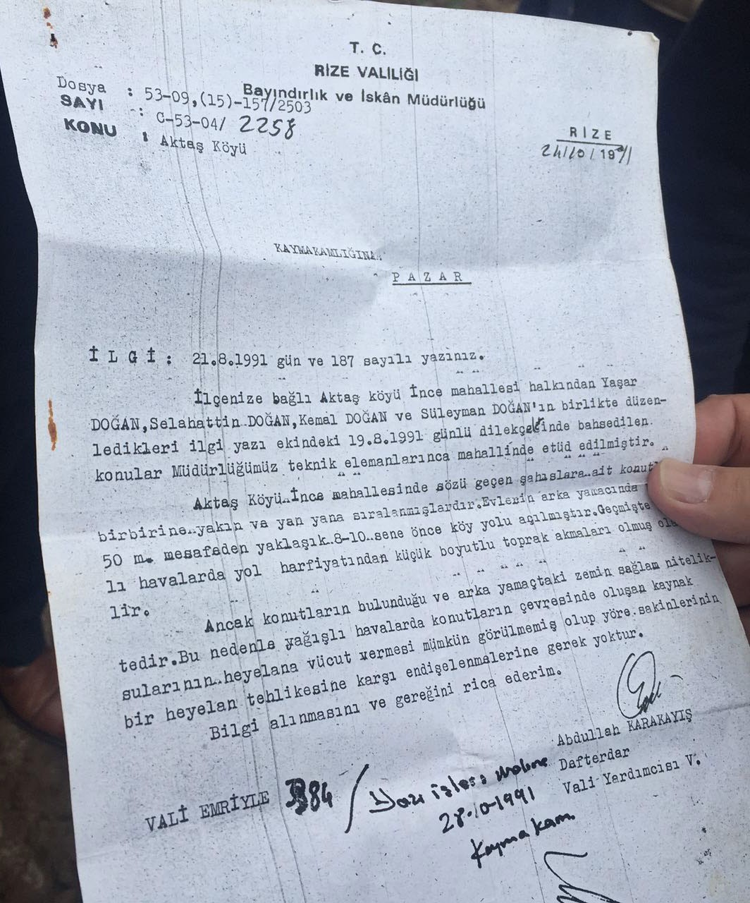 Kemal Doğan ve akrabalarının 25 yıl önce yazdığı başvuru dilekçesinde dönemin Rize Valiliği yetkilileri, yapılan inceleme sonrası "Burada heyelan için endişelenmelerine gerek yoktur" cevabını vermiş.