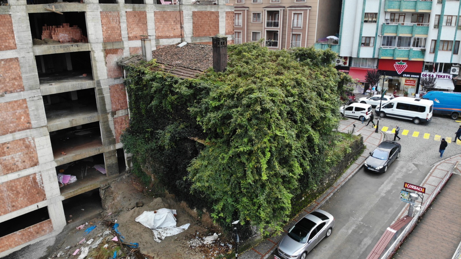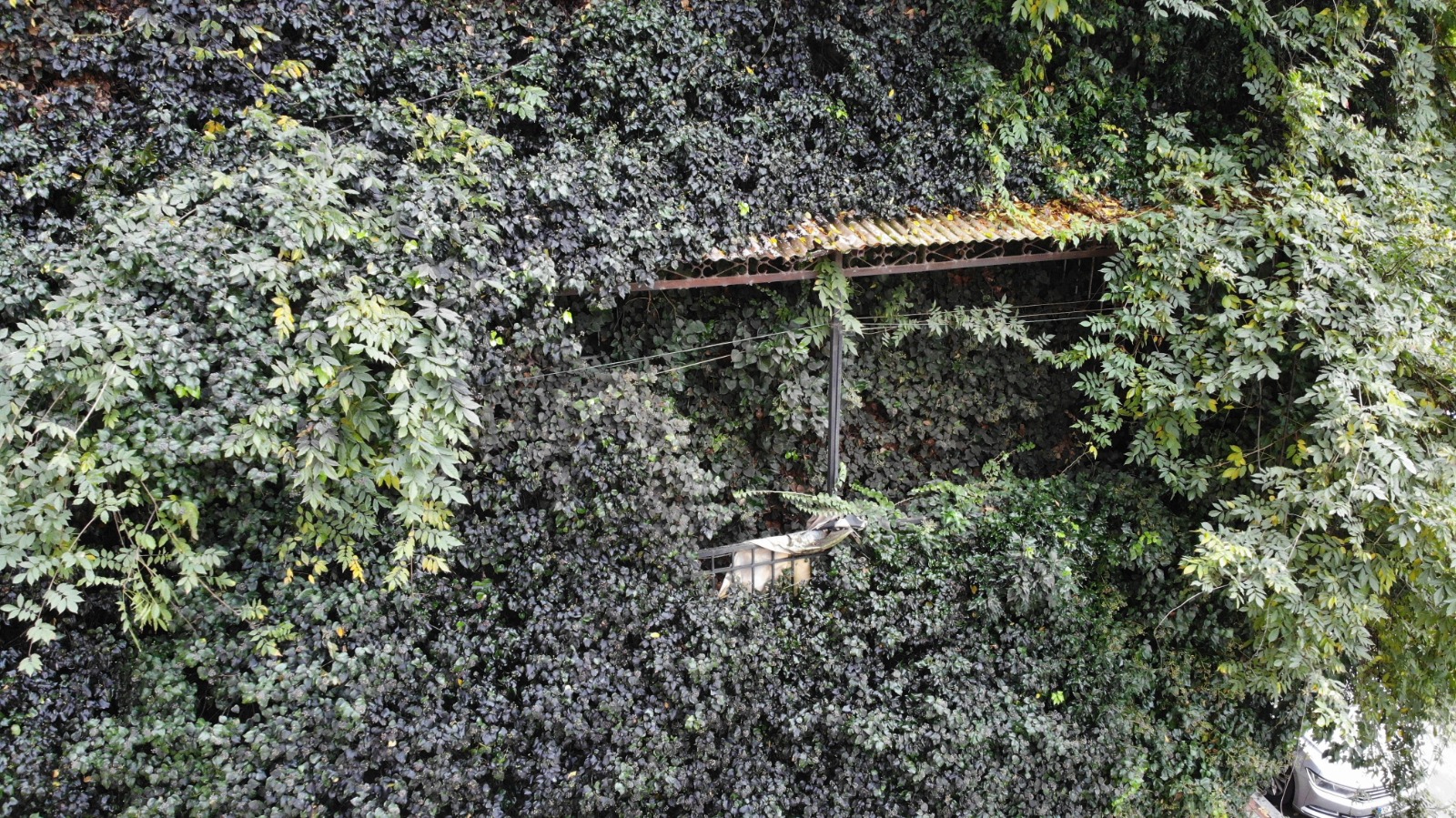 Merkez Tophane Mahallesi’nde bulunan 2 katlı evin 3 cephesinden 2‘si ilgisizlik nedeniyle tamamen sarmaşıklarla kapandı. Geriye kalan tek cephesini de sarmaya başlayan sarmaşıklar nedeniyle ev ilginç bir görünüm kazandı.