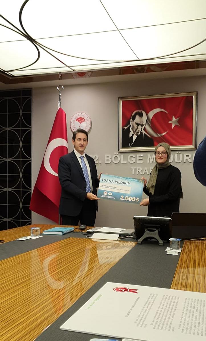 22. Bölge birincisi ve Türkiye ikincisi Rize Şehit Erhan Dural Kız Anadolu İmam Hatip Lisesi 8. sınıf öğrencisi Tuana Yıldırım, ödülünü Trabzon'da düzenlenen törenle aldı.
