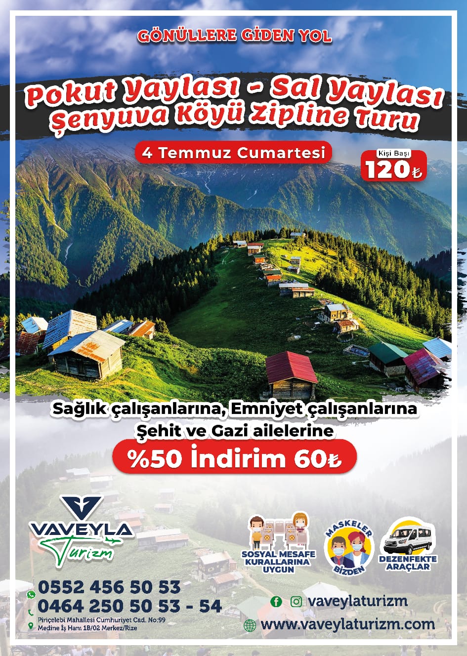 Rize'de hizmet veren Vaveyla Turizm, pandemi sürecinde gece gün demeden hizmet veren sağlık çalışanları ve Emniyet personelini unutmadı. Korona virüs salgını nedeni ile günlerce ailesinden uzak kalan Sağlık çalışanları ve Emniyet personeli için kar gözetmeden %50 indirim ile Tur düzenlendi. Yaylalarda stresten uzak bir gün geçirmeleri için böyle bir organizasyon düzenlenirken, Vaveyle Turizm işletme müdürü Mahmut Aslan Cumartesi günü düzenlenecek olan organizasyon için Sağlık çalışanları, Emniyet Personeli, şehit ve gazi yakınları için %50 indirim yapacaklarını belirterek :" Sağlık çalışanlarına ne kadar teşekkür etsek az. Pandemi sürecinde en önde hizmet veren canlarını ortaya koyan yüce gönüller onlar. Cumartesi günü Pokut yaylasına 120 TL’ye düzenlediğimiz sosyal mesafeli turumuzu Sağlık çalışanlarımıza ,Emniyet çalışanlarımıza , şehit ve gazi yakınlarına %50 indirim yaparak 60 TL’ye indirmiş oluyoruz. Buradaki amacımız kar gözetmeksizin onların gönüllerine dokunabilmek.” İfadelerini kullandı.