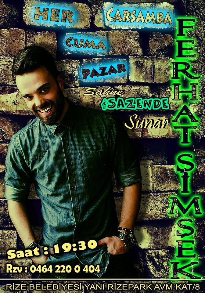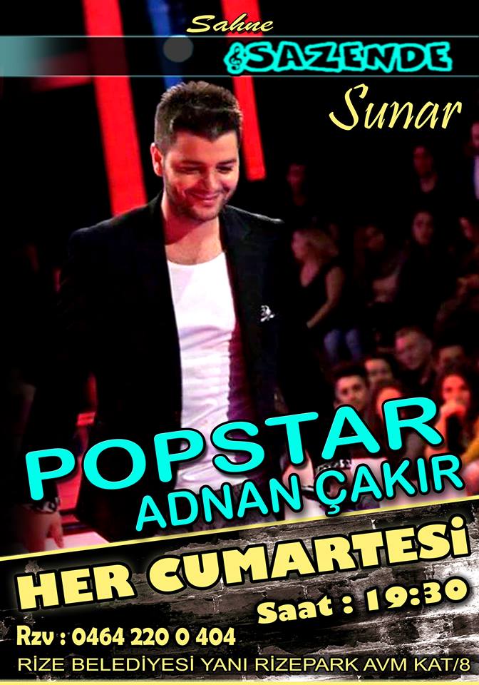 Sazende Cafe & Canlı Müzik Popstar Adnan Çakır , Risingstar yarışmasında milyonların beğenisini toplayan Ferhat Şimşek, Rize’nin güçlü sesi Sami Bilgin ve Karadeniz’in en kaliteli orkestrası ile Müzik şöleni sunuyor.