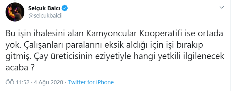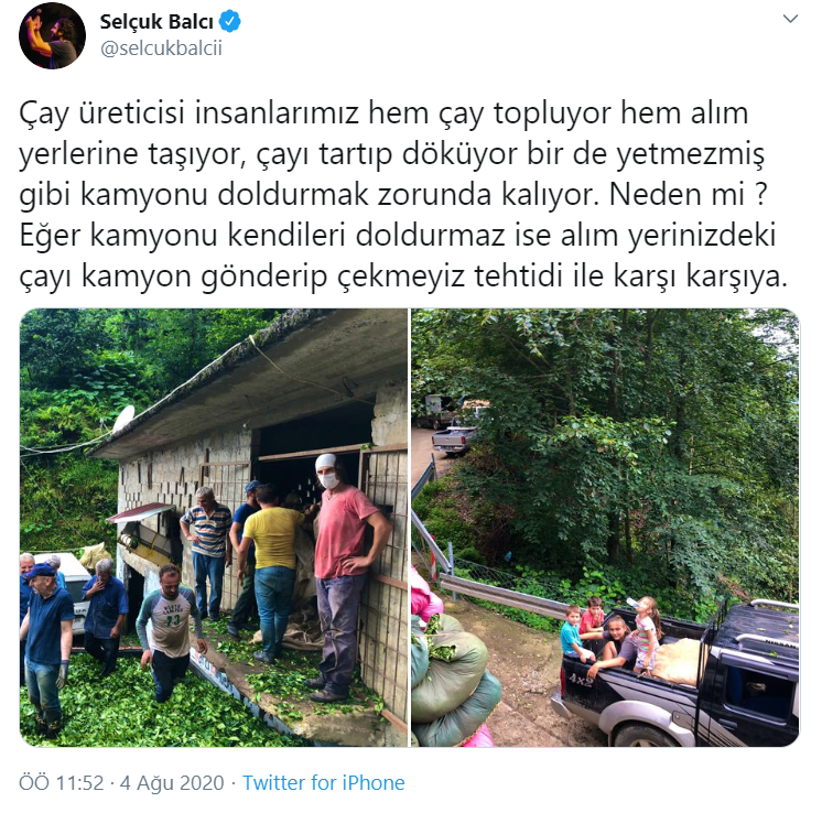 Ünlü sanatçı Selçuk Balcı, sosyal medya hesabından yaptığı paylaşımla "Çay üreticisinin eziyetiyle hangi yetkili ilgilenecek acaba?" diye sordu.