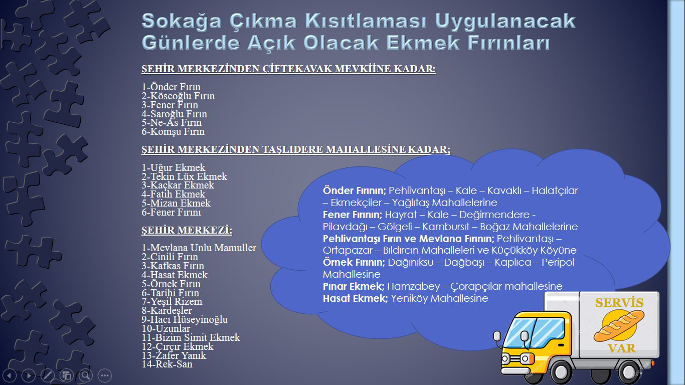 ŞEHİR MERKEZİNDEN TAŞLIDERE MAHALLESİNE KADAR : Uğur Ekmek, Tekin Lüx Ekmek, Kaçkar Ekmek, Fatih Ekmek, Mizan Ekmek, Fener Fırını