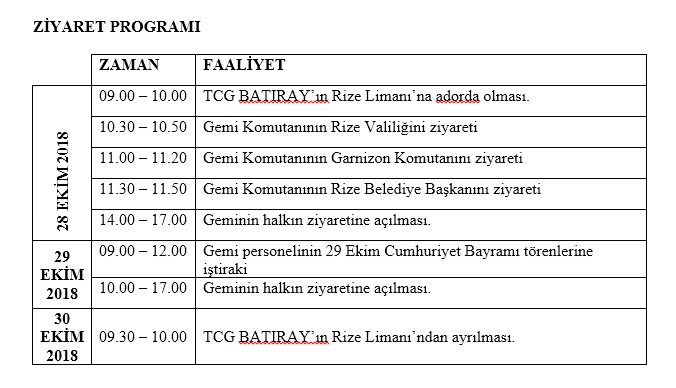 Karadeniz Uyum Harekatı kapsamında TCG BATIRAY Denizaltısı 28-30 Ekim 2018 tarihleri arasında Rize Limanını ziyaret edecek
