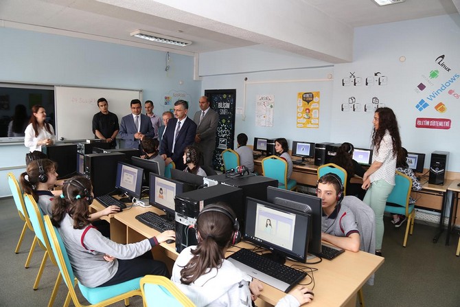 Vali Bektaş, okul ziyaretlerinin son bölümünü Hüseyin Yardımcı İlkokuluna ayırarak burada İngilizce Dil Eğitim Sistemi "DynED" ile yabancı dil eğitimi veren sınıfı ziyaret ederek, öğrencilerin DynED sistemi hakkındaki görüşlerini kendilerinden dinledi.