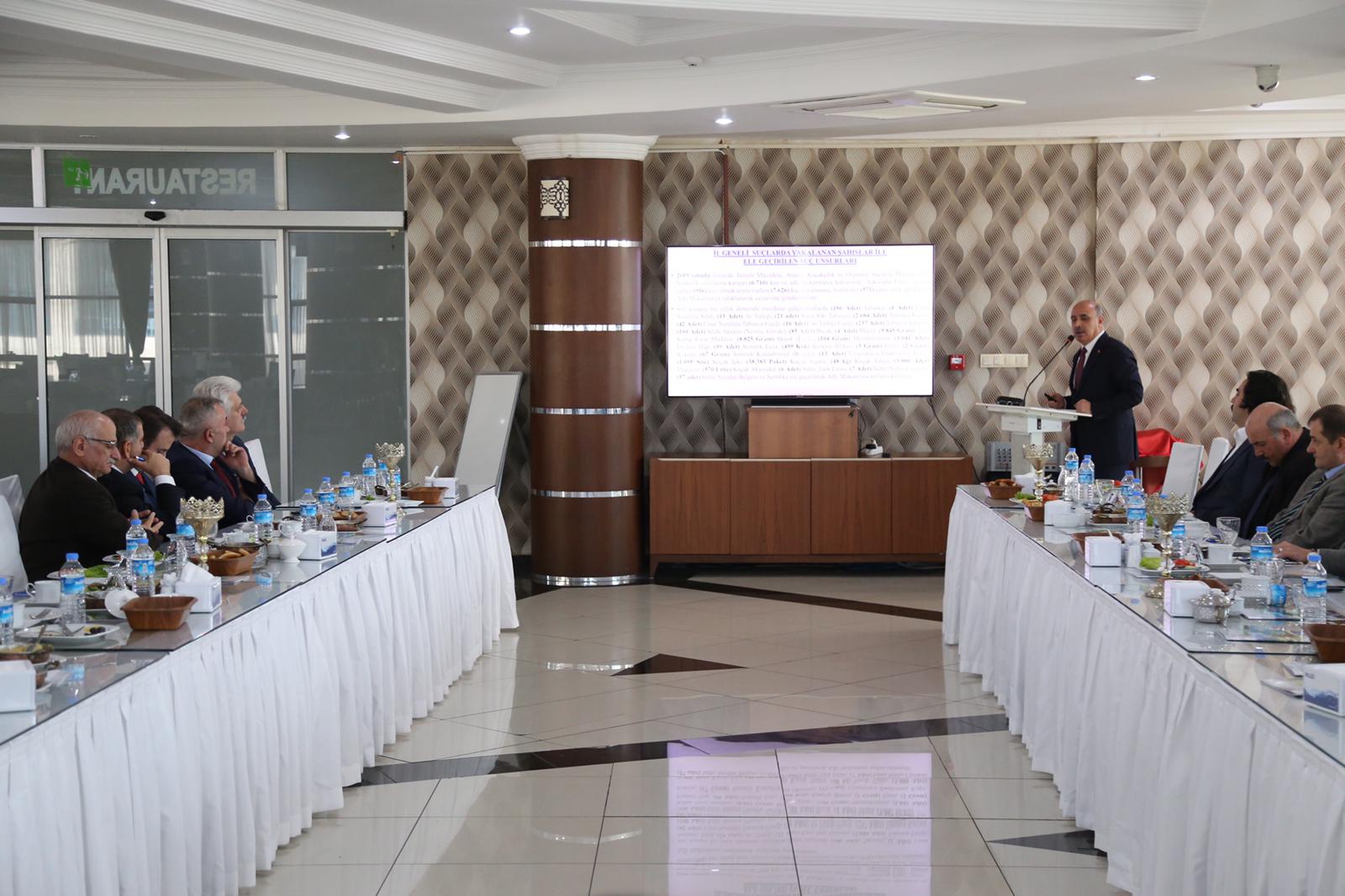İl merkezi ve ilçelerin genel asayiş durumları hakkında bilgilendirmenin yapıldığı toplantıda, uyuşturucu ve kaçakçılıkla mücadele, karayolu trafik güvenliği, genel güvenlik, düzensiz göç ve asayişi etkileyen konular değerlendirilerek alınması gereken önlemler ve kurumlar arası koordinasyon hakkında görüş alışverişinde bulunuldu.