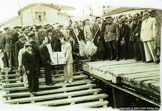 ÇAY RİZE’de KARAYA VURDU : Rusya’dan sandıklarla getirilen ilk parti çay tohumu ve fidanları Rize iskelesinde törenle karşılandı. Fotoğrafta çay tohumlarını kutu içerisinde taşıyan Hızır Nurik (1), Kazım Kartal(2) ve Zihni Derin’i (3) karşılayan Rizeliler görülüyor. Karşılayanlar arasında Rize Valisi Nuri Türkkan (4) ve Müdafaa-i Hukuk Cemiyeti üyesi Lazzade Mustafa (5) da yer almaktadır-1937.
