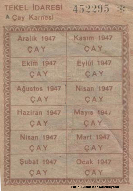 ÇAY KARNEYE BAĞLANDI : 1947 yılında çay Tekel İdaresi’nin verdiği çay karnesi ile satılıyordu.