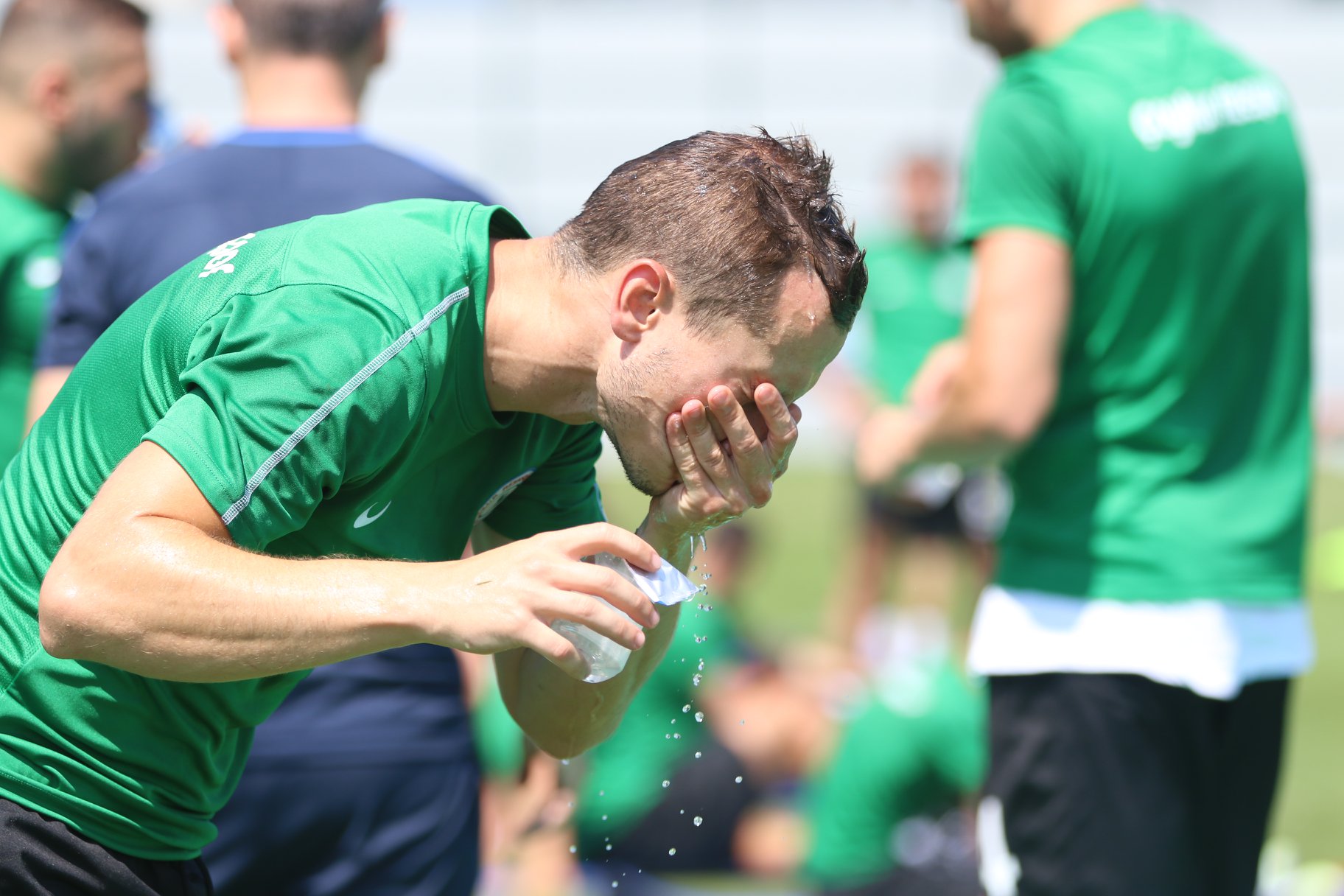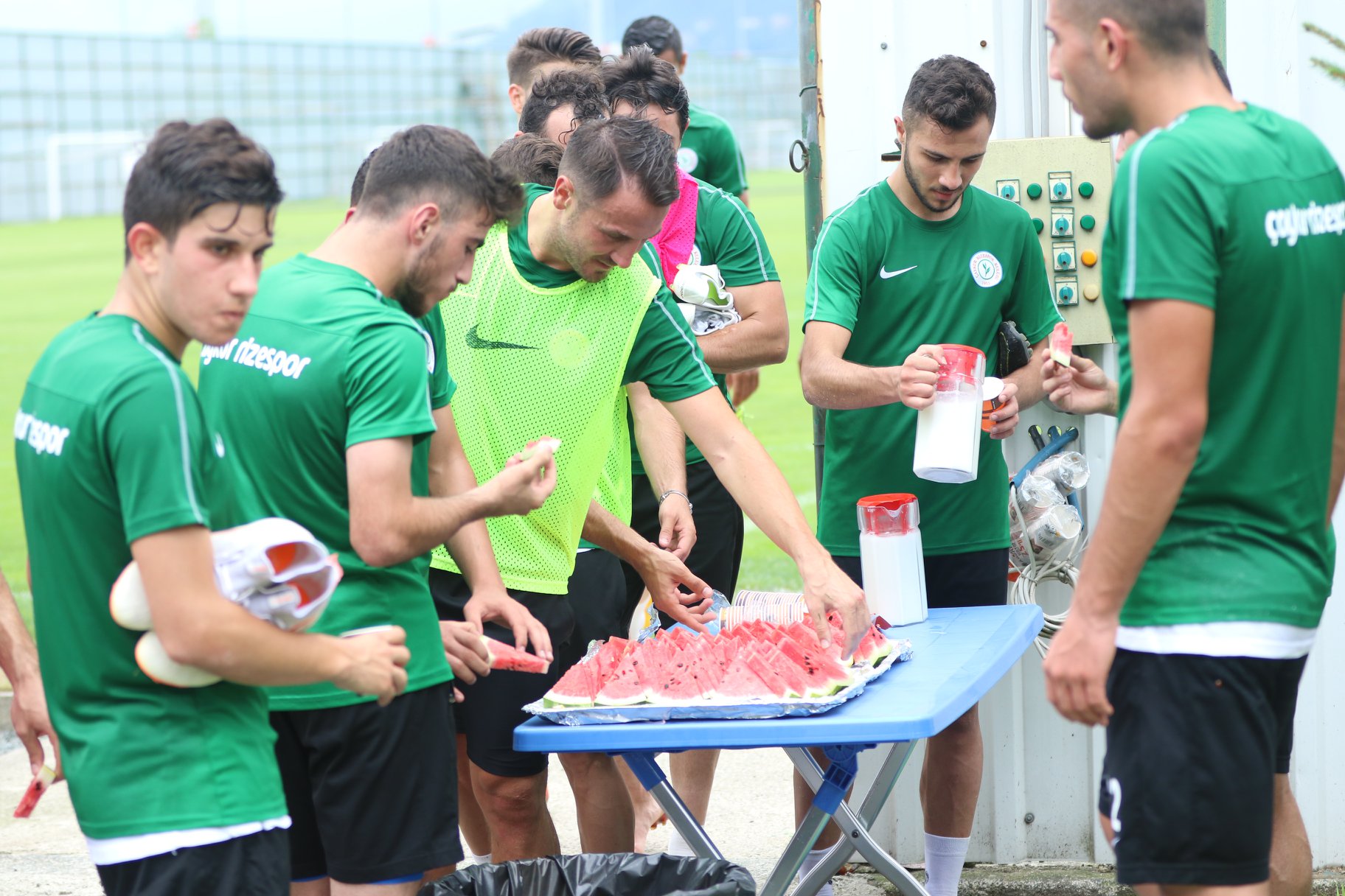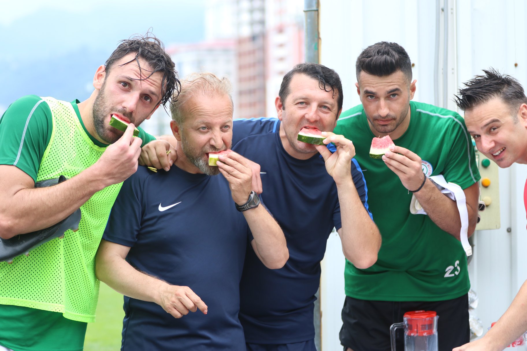 Çaykur Rizespor Yeni Sezona Hazırlanıyor.Yşil mavililer kendi tesilerinde günde çift idmanla gerçekleştirdiği antremanları yoğun güneş ve aşırı nem'e rağmen sürdürüyor.Futbolcular verilen aralarda ise bol bol su içip karpuz yiyerek yüzde 93 lere çıkan neme karşı koymaya çalışıyor